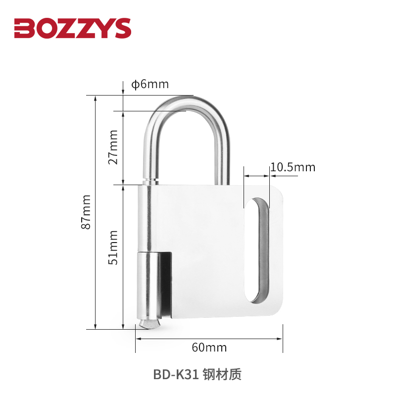 BOZZYS 防撬搭扣鎖 BD-K31 帶有 27mm鎖梁內(nèi)徑,可容納6把掛鎖。非常適合在每個鎖定點(diǎn)由多名工人鎖定,搭扣可在進(jìn)行維修或調(diào)整時保持設(shè)備不工作。在從搭扣上取下最后一個工人的掛鎖之前,無法打開控制。