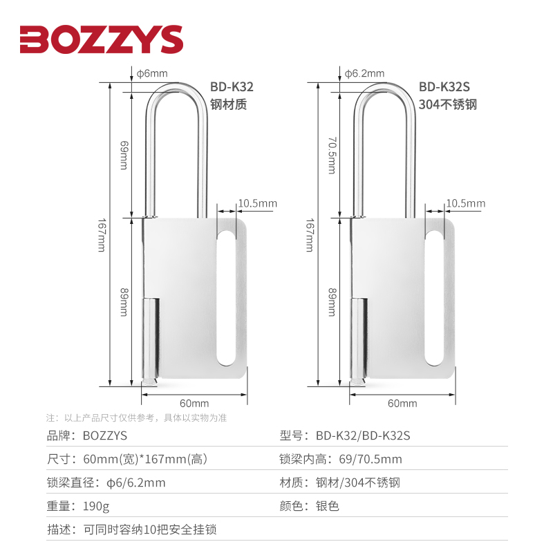 蝴蝶型搭扣鎖尺寸為60 mm x 167 mm,鉗口內徑為71mm,可容納10把安全掛鎖。
