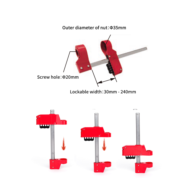 法蘭盲板鎖具BD-FL01適用于法蘭盲板寬度30mm-240mm之間;螺母外徑孔:φ35mm;螺桿孔徑:φ20mm。