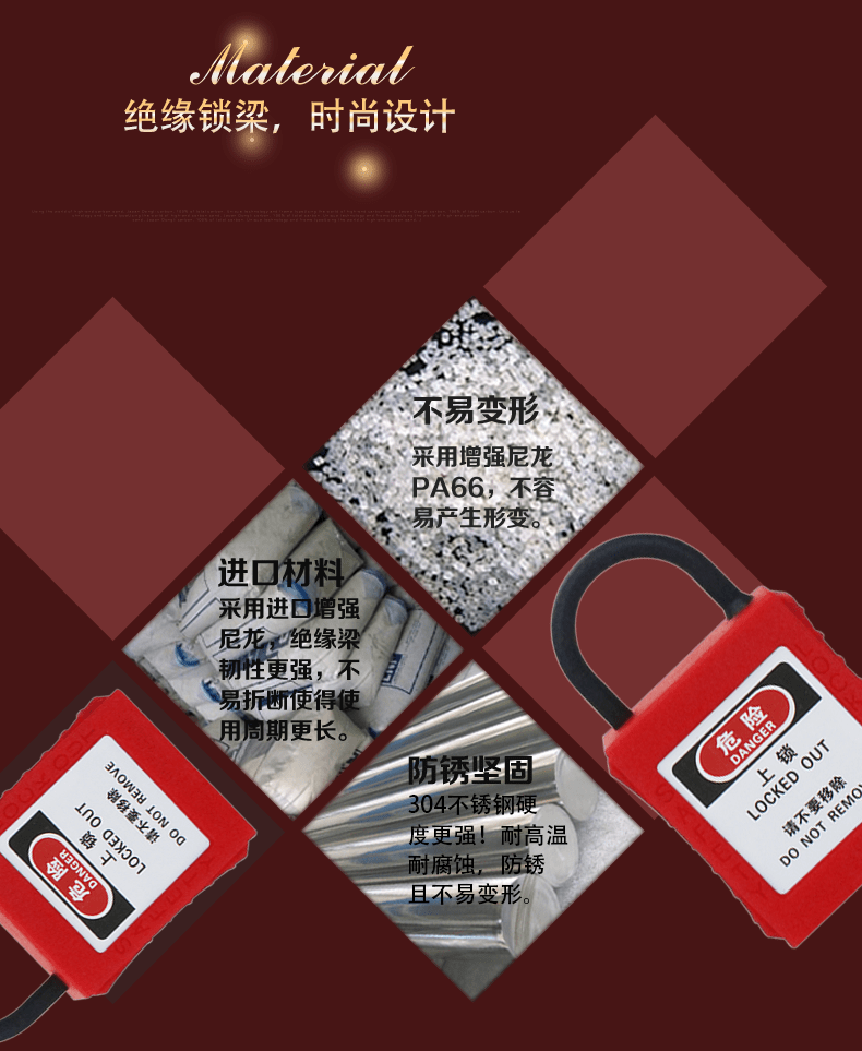 a.此安全鎖具的鎖體由工程塑料增強(qiáng)尼龍PA制成,采用一體式外殼設(shè)計(jì),更加耐用,抗溫差(-57℃-+177℃)、抗沖擊,金屬鎖梁采用鍍鉻處理。也可上鎖掛牌。